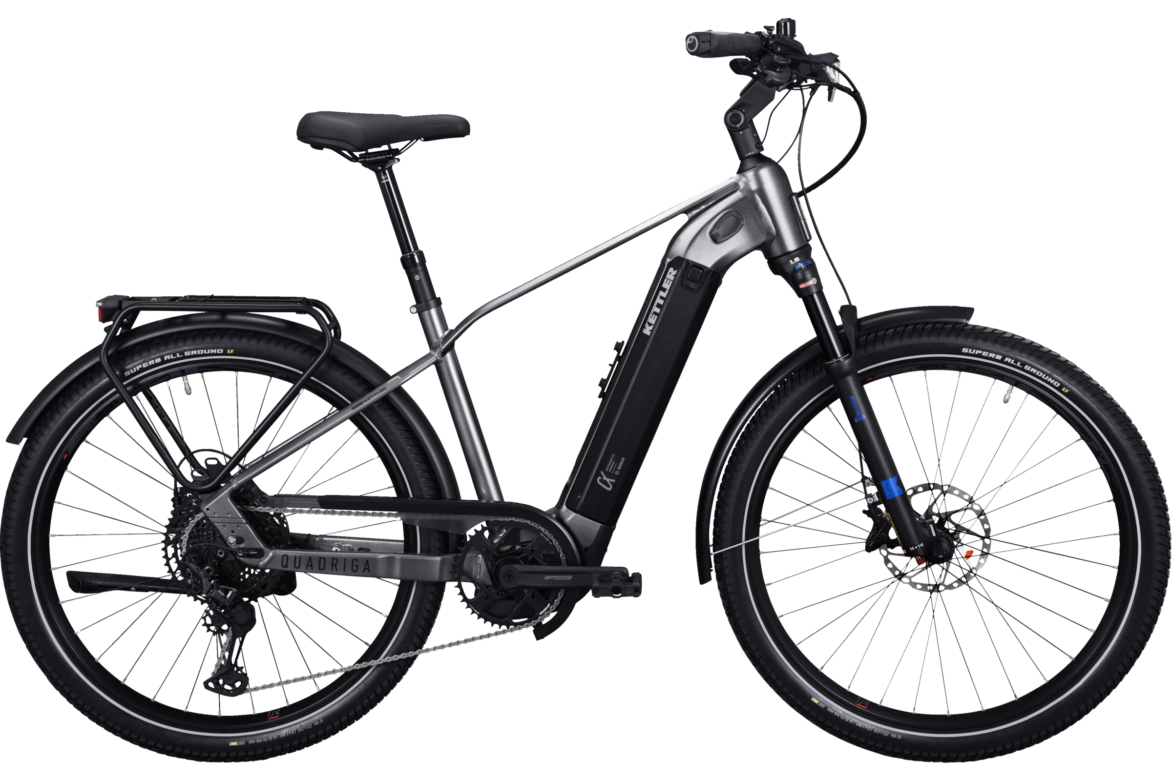 Mit zwei PowerTube-Akkus, formschön ins Unterrohr integriert, ist das QUADRIGA DUO CX12 in Sachen Reichweite kaum zu schlagen. Die Speichereinheit mit 1250 Wattstunden versorgt einen starken Bosch Motor vom Typ Performance Line CX. Die Motorsteuerung erfolgt über das Kiox Farbdisplay mit umfangreichen Konnektivitätsfunktionen. Für hohen Komfort sorgen 100 mm Federgabel sowie eine gefederte Sattelstütze, die zusätzlich absenkbar ist. Die hochwertige SHIMANO XT 12-Gang Kettenschaltung sorgt für seidenweiche Schaltvorgänge und standfeste Vierkolben-Scheibenbremse für die nötige Verzögerung. Ebenfalls an Bord ist ein superheller 100 Lux Strahler.