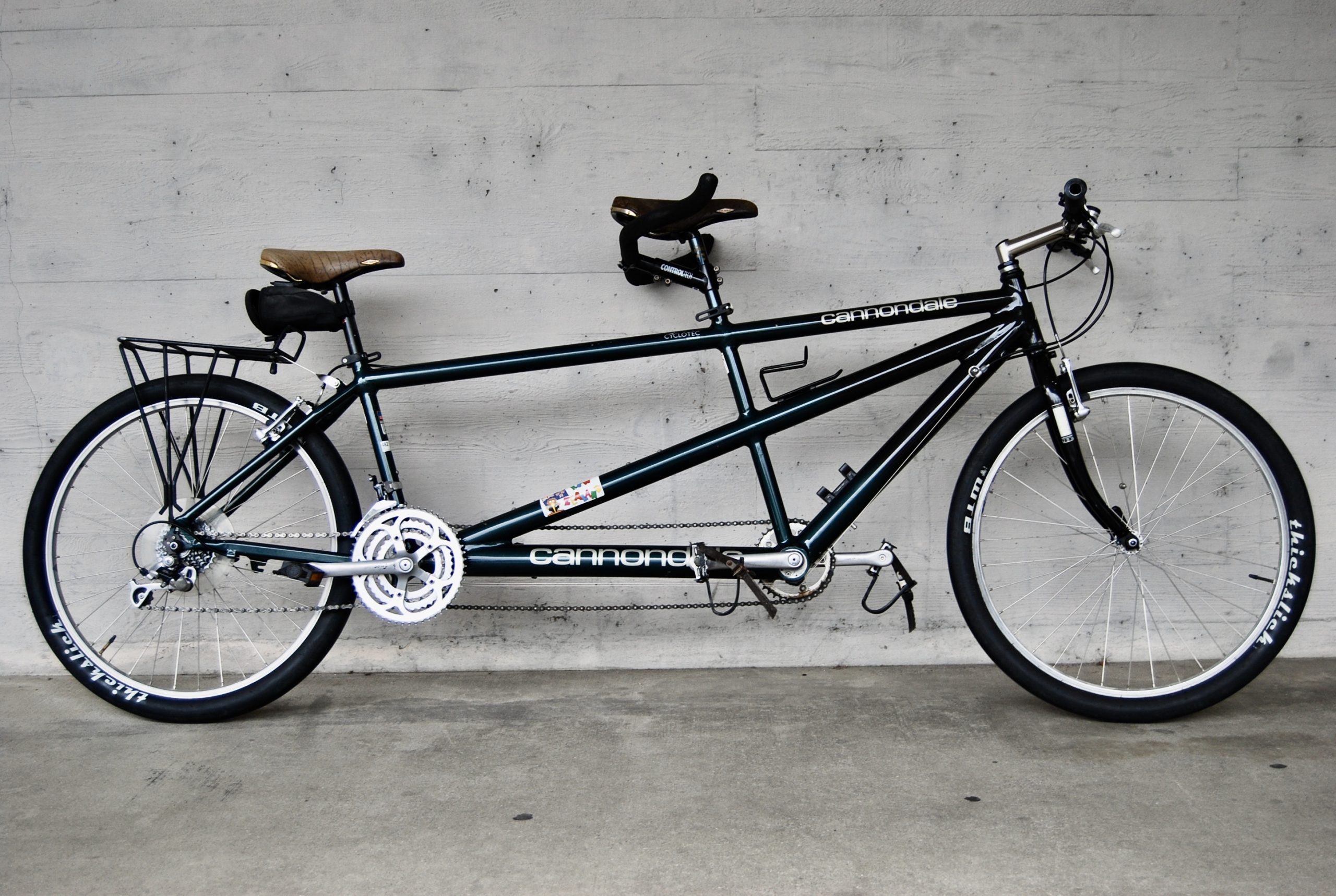 Ein tolles Tandem in schönem grün von Cannondale. Es ist mit 21 Gängen, Bidonhalter, Satteltasche, Hörnlilenker hinten sowie dem praktischen Gepäckträger und einer Aufhängung für eine Pumpe ausgestattet. Dieses Bike lädt zu tollen Ausfahrten zu zweit ein.
