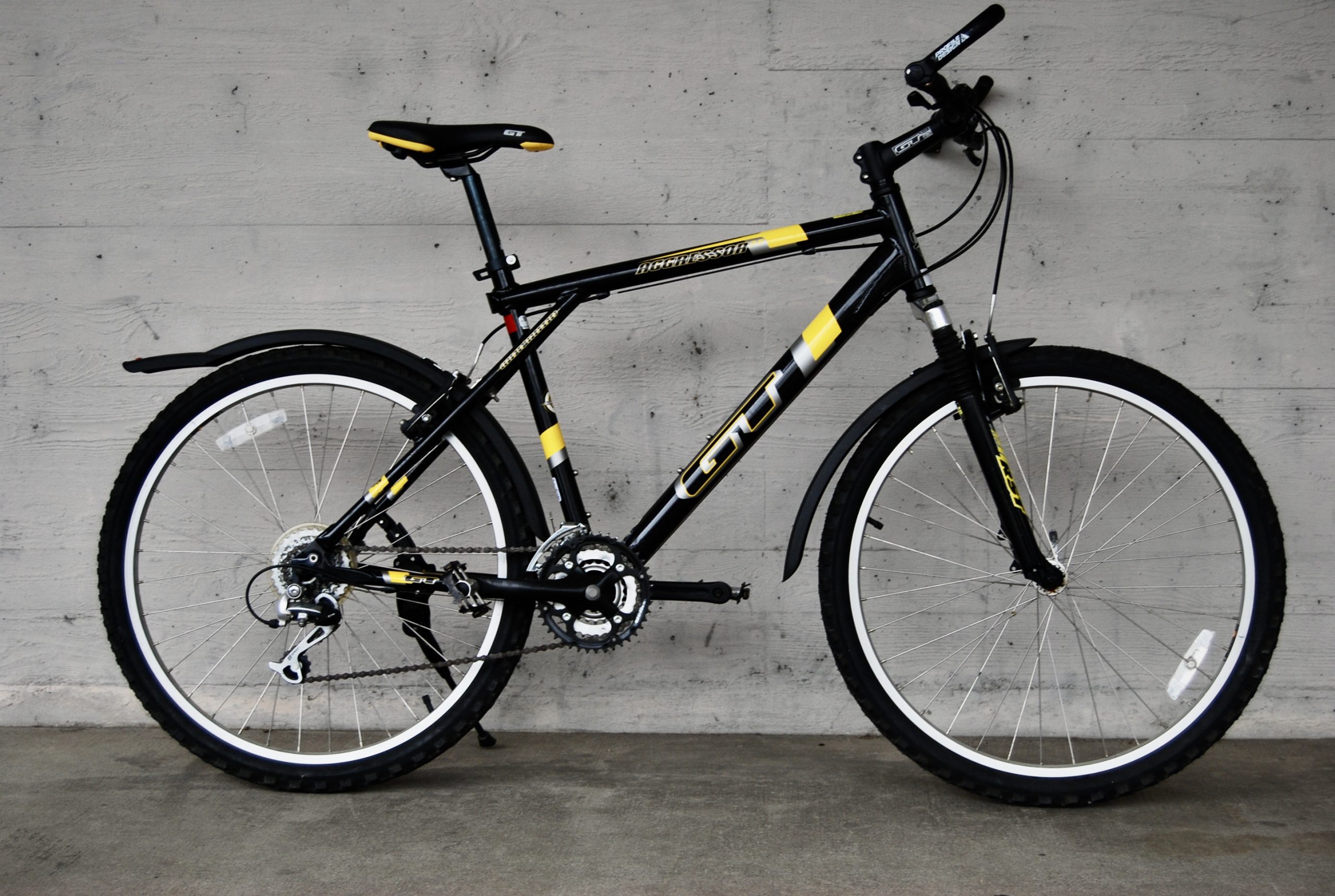 Dieses lässige Mountainbike ist das Agressor 2.0 von GT in schwarz/gelb. Es ist mit 24 Gängen, Federgabel, Speichenreflektoren, Hörnligriffen sowie dem praktischen Ständer und Schutzbleche vorne und hinten ausgestattet. Geeignet für den Alltag sowie Ausfahrten mit Freunden und Familie.